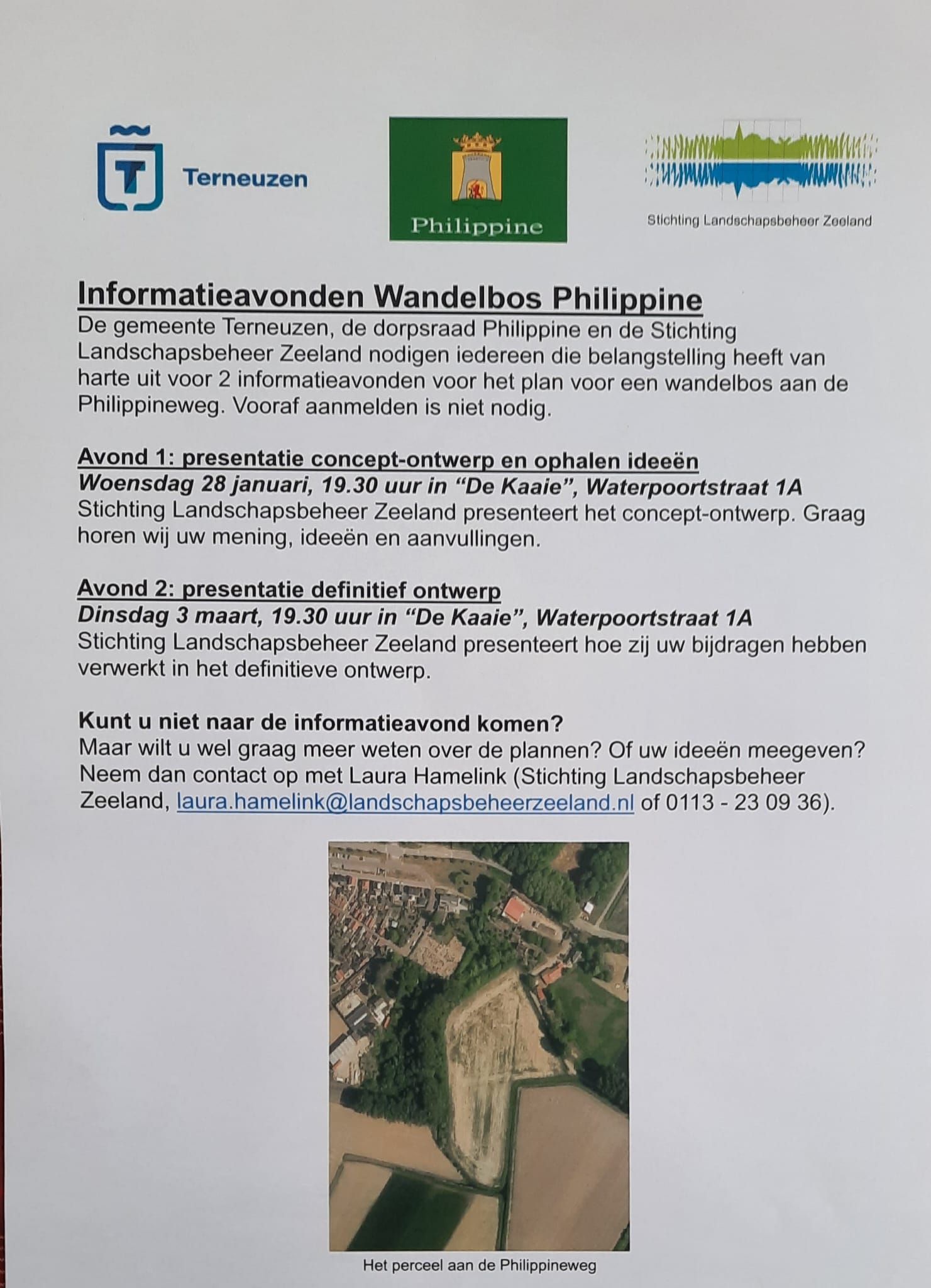 De gemeente Terneuzen, de dorpsraad Philippine en de Stichting Landschapsbeheer Zeeland nodigen iedereen die belangstelling heeft van harte uit voor 2 informatieavonden voor het plan voor een wandelbos aan de Philippineweg. Vooraf aanmelden is niet nodig.